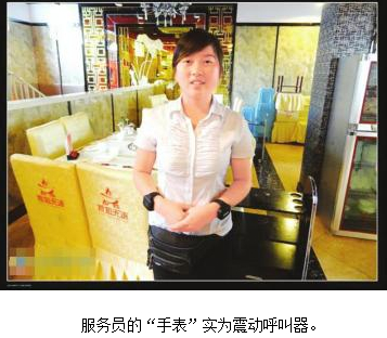 據大堂經理介紹,每個服務員手腕上,都戴著一個像手表一樣的“服務呼叫器”,上有加菜、酒水、買單、服務和取消等功能。當客人有需要時,按清單上的按鈕,其所在餐桌的號數、所需服務的種類,就會通過該服務呼叫器顯示,以震動方式告知服務員。