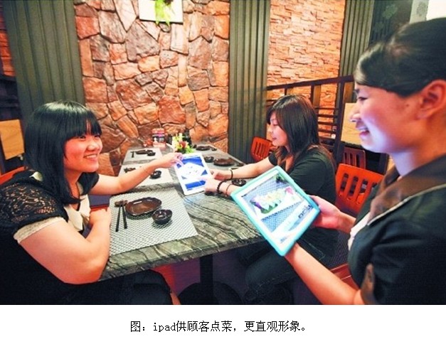 到餐廳吃飯,首先要做的就是點菜。傳統的點菜方式都是服務員拿著一本菜單,供顧客選取菜樣,再把菜樣填在一張單上。T淘園內的一家日本料理店卻別出心裁,使用ipad供顧客點菜。