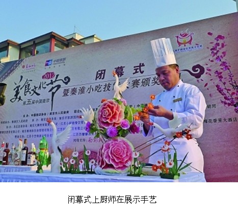 昨日,歷時一個月的“2012第五屆中國南京美食文化節”在南京市夫子廟秦淮風光帶圓滿落幕。閉幕式上,名店大廚現場PK廚藝,創新的秦淮小吃吸引了廣大市民前往品嘗。此次美食節由南京市政府、南京市商務局主辦,南京市餐飲商會協辦,揚子晚報參與承辦。美食節以“民國大菜”和“秦淮小吃”為主題,組織了一系列活色生香的美食活動,市民參與度極廣,整個美食節既體現南京美食文化水平,也極具互動性,在社會上產生了廣泛的影響力。