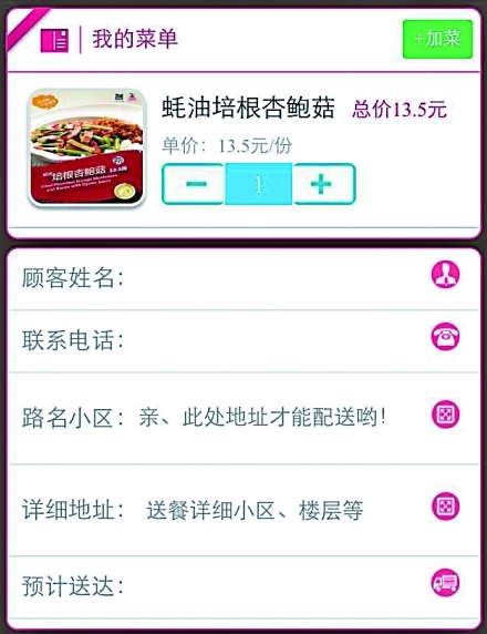 昨日,記者嘗試著用手機(jī)加上重慶多家餐飲店的官方微信賬號(hào),進(jìn)入點(diǎn)餐頁面,上面列著各種菜品和酒水的名稱、價(jià)格及實(shí)物圖片,點(diǎn)擊想要的菜品,按照要求填寫姓名、電話和地址等信息,再點(diǎn)擊提交,一份訂單就發(fā)送出去了。