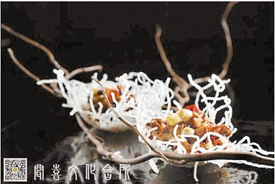 比如,一道名叫玉樹后庭花的菜,其實就是宮保豆腐,造型非常優(yōu)美,將宮保豆腐裝在像是樹枝的丫上,每個丫上還有一個雪白的類似鳥巢的盛器,看起來晶瑩剔透。