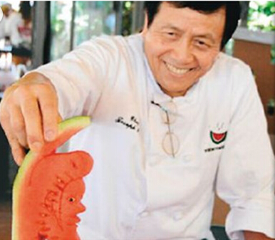 在整個西瓜節(jié)上最引人注目的是雕西瓜活動,廚師們紛紛大展雕工,而華裔廚師潘國強(qiáng)最受注目。兩周前剛剛在一個60萬廚師參加的美國廚師比賽上獲得2014年度廚師稱號的潘國強(qiáng),是歷史上唯一獲得此獎項的華裔廚師。在他的刀下,各種造型被雕刻得栩栩如生,從熱帶魚到中國龍,從玫瑰花到小兔子,快的時候只用20秒就可以雕出讓人驚嘆的西瓜藝術(shù)品。