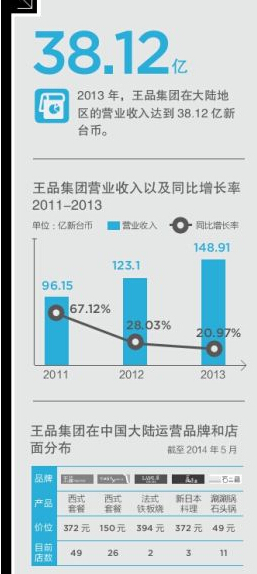 據(jù)王品集團(tuán)的財(cái)報(bào), 2013財(cái)年,其在大陸的品牌門店?duì)I收達(dá)到7.7億元,較2012年的5.6億元相比,增長(zhǎng)37.5%。
