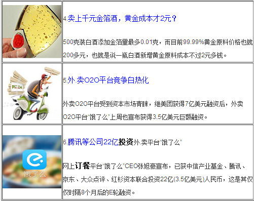 洋快餐不僅在中國的市場遭受挫折,在美國本土也因為種種問題導致銷售滑坡,百勝集團公布第四季度財報虧損巨大,麥當勞CEO黯然下臺。春節(jié)近了,衛(wèi)計委擬批準金箔為食品添加劑,因為熱議。外賣平臺受到資本市場青睞,繼美團獲得7億美元融資后,外賣O2O平臺“餓了么”上周也宣布獲得3.5億美元巨額融資。一起來關(guān)注本周餐飲熱點: