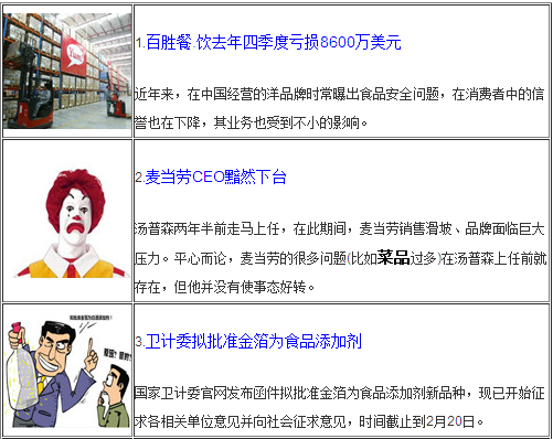 [摘要] 百勝集團公布第四季度財報虧損巨大,麥當勞CEO黯然下臺。春節(jié)近了,衛(wèi)計委擬批準金箔為食品添加劑,因為熱議。