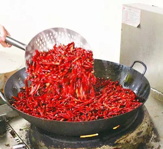 大鐵鍋上火,下大豆油50斤燒至三成熱,調(diào)成中火,陸續(xù)下入泡椒50斤,不停翻炒約半小時(shí),與此同時(shí)將整塊的永川豆豉3斤剁成細(xì)粒(不要剁碎),至泡椒炒出香后下入剁好的豆豉再炒約15分鐘,下入泡菜丁25斤,繼續(xù)翻炒半小時(shí),一起炒香后停火。