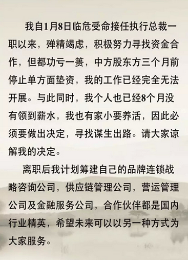 只可惜短短4個多月的時間,戚東就已招架不住,提出辭職。其在辭職信中坦言,自接任總裁一職以來,積極努力尋找資金合作,但都功虧一簣。中方股東也在三個月前就已經停止單方面墊資,使得運營工作完全無法開展。而他本人已經有8個月沒有領到薪水。