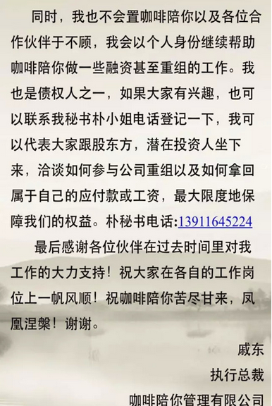 今年5月25日,咖啡陪你執行總裁突然辭職,而他本人也爆出已經有8個月沒有領到薪水。也就是說,從去年8月份開始,“咖啡陪你”就已拖欠其工資。