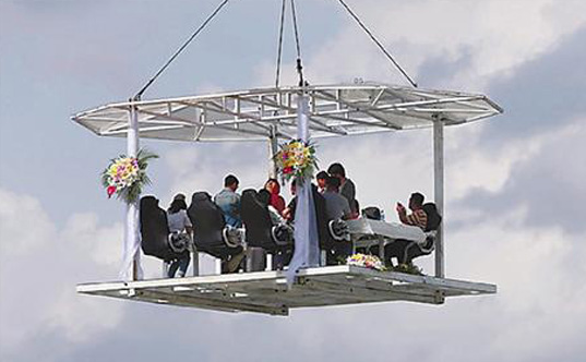 據(jù)聞,“空中餐廳”四周不設(shè)圍欄,享受餐飲服務(wù)的價(jià)格為每位8888元。看到“空中餐廳”被起重機(jī)吊著緩緩升空,不少圍觀市民嘖嘖稱奇,紛紛舉起相機(jī)、手機(jī)拍照留念,并感嘆:“這是用生命在吃飯呀!”、“這吃的不是飯,而是刺激體驗(yàn)!”。