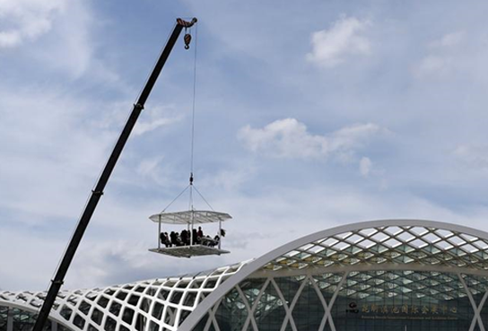 據(jù)了解,“空中餐廳”長(zhǎng)4.5米、寬3米、高2.5米,重約3噸。加上8名顧客、1名廚師及1名服務(wù)員,重約4.5噸,由一臺(tái)重32噸、高40米的起重機(jī)吊在30米高空。