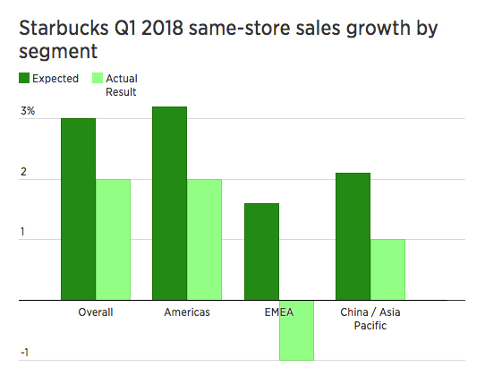 周四公布的2018財年一季度財報顯示,星巴克季度營收上漲6%至60億美元,但是全球同店銷售僅上漲2%,不及StreetAccount預期的3%。