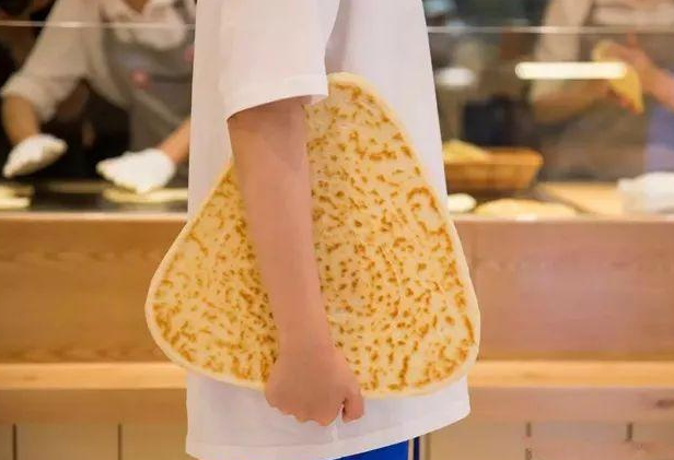 盡管店里的常規款肉夾饃已經比外界的大一圈,這里還出了一款巨型肉夾饃,需要5個人才能吃掉1個。這塊饃夾在手里的感覺就像一塊三角形的盾牌。