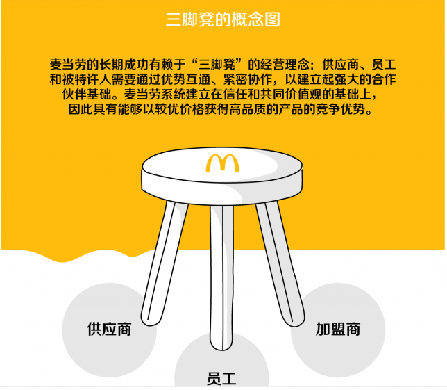 在麥當(dāng)勞著名的“三腳凳”文化中,供應(yīng)商、被特許人和麥當(dāng)勞被視為缺一不可的組成部分,三者在共同的價值觀下,優(yōu)勢互通、緊密協(xié)作。